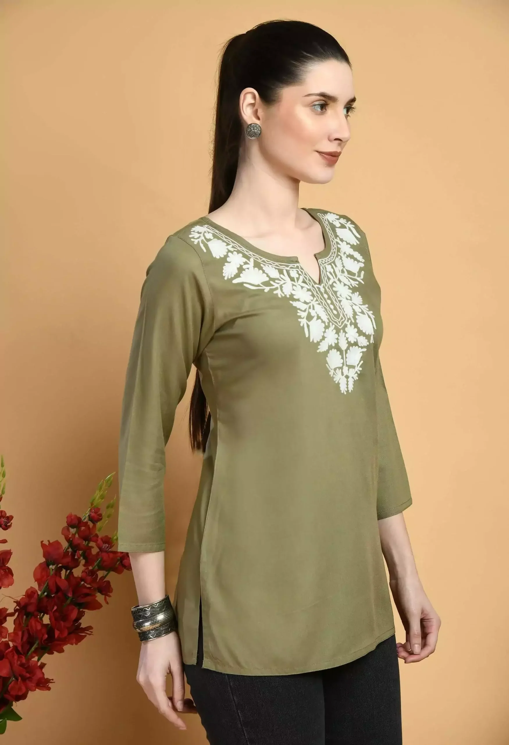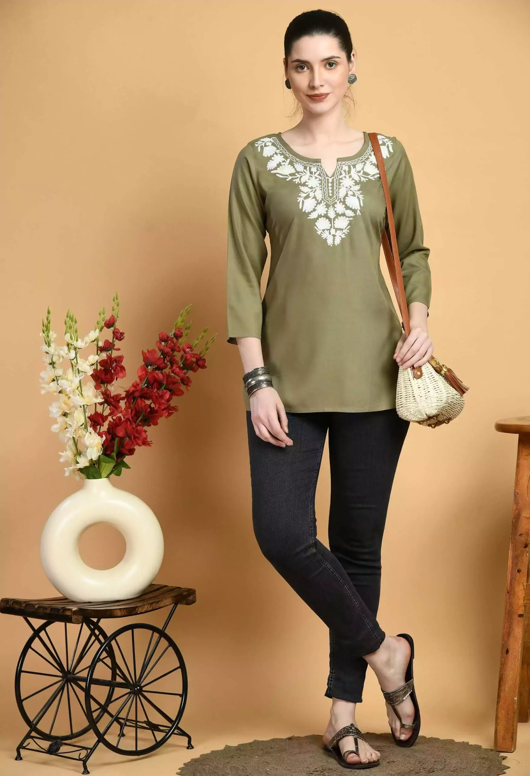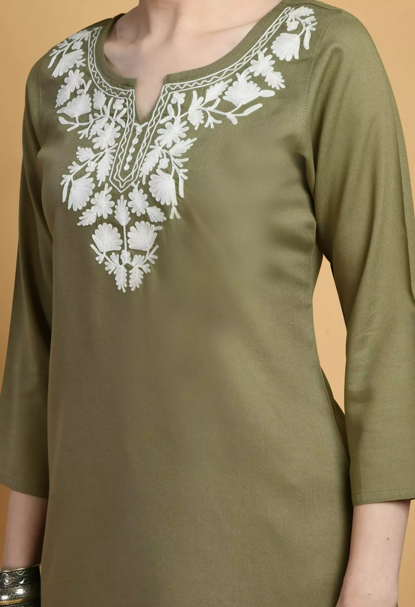 Home Short Kurtis Olive Colored Kashmiri Short Kurti